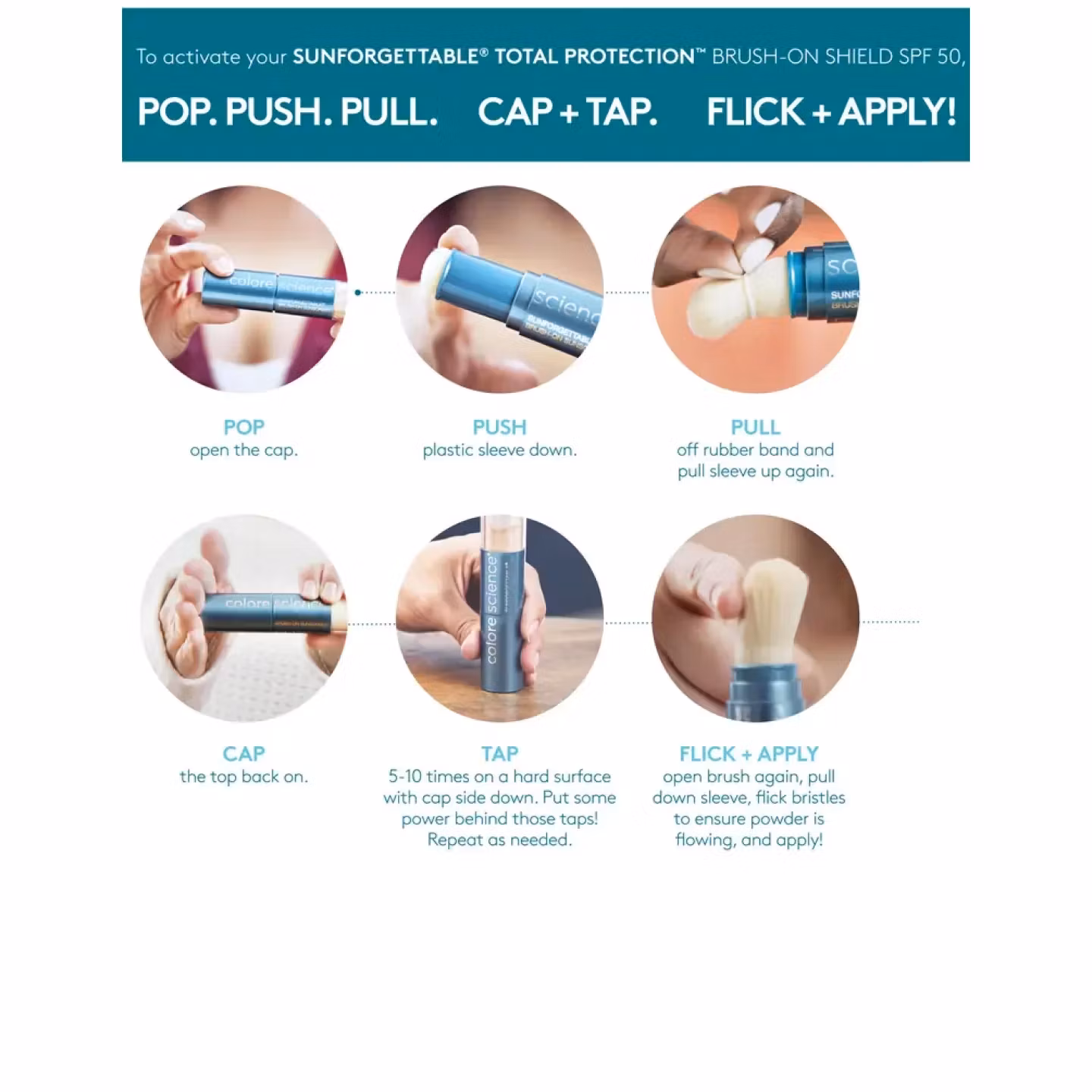 3. PÅFØR: Bruk små sirkulære bevegelser, sveip direkte på tørr bar hud, fuktet hud eller over sminke. Påfør sjenerøst over ansiktet i minst 60 sekunder mens du passerer flere ganger. Ikke glem ørene, nakken og andre områder! Fyll på mer pulver i bust ved å gi børsten en god rist med busten vendt nedover, eller sett på, bank og knip etter behov under påføring. Hvis du påfører direkte over en fuktighetskrem, primer eller flytende foundation, sørg for at produktene har stivnet helt før du påfører Sunforgettable®. Påfør på nytt minst annenhver time for fortsatt beskyttelse.